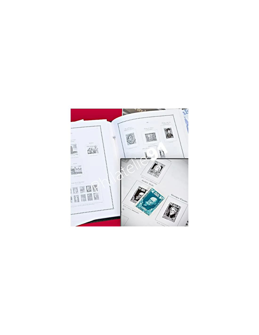 Liseré noir, avec reproduction du visuel des timbres en noir et blanc : Tous les timbres types sont illustrés dans les recharges FS et MS. Sous chaque timbre figure la numérotation Yvert et Tellier, sa valeur faciale et sa couleur.