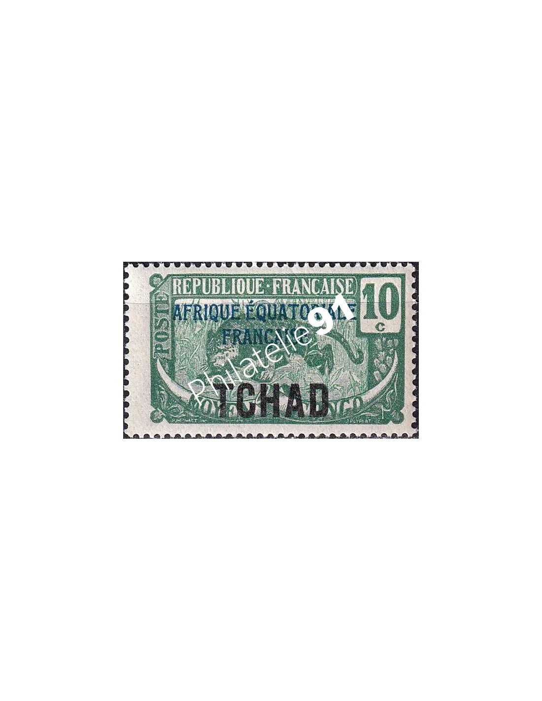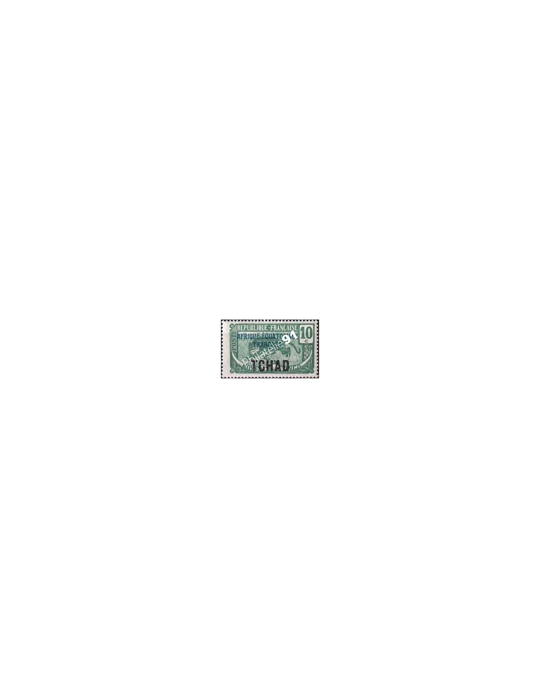 Timbre surchargé "TCHAD" de 1922 (n° 5), avec surcharge supplémentaire bleue "AFRIQUE ÉQUATORIALE FRANÇAISE" (Type I).