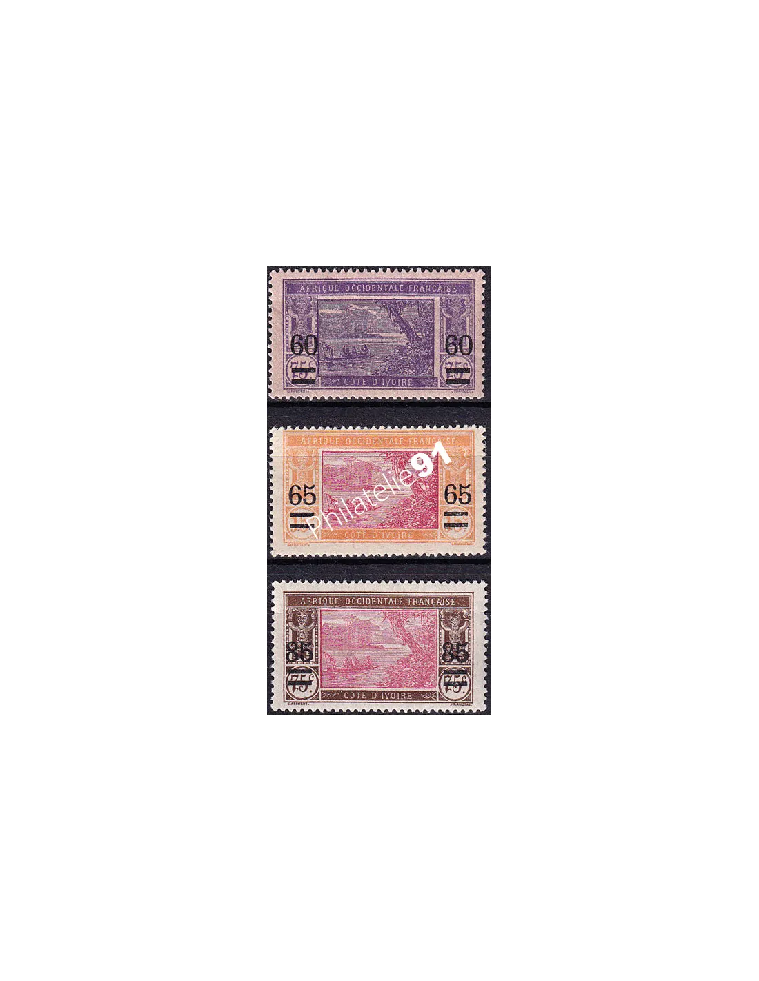 COTE D'IVOIRE - n° 59 à 61 * - Lagune Ébrié - Timbres de 1913-1917 surchargés