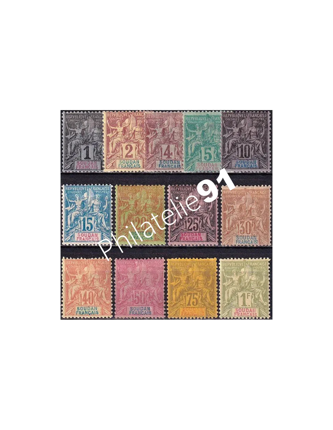 Timbre avec mention "SOUDAN FRANÇAIS" dans le cartouche, en rouge, rose ou bleu.