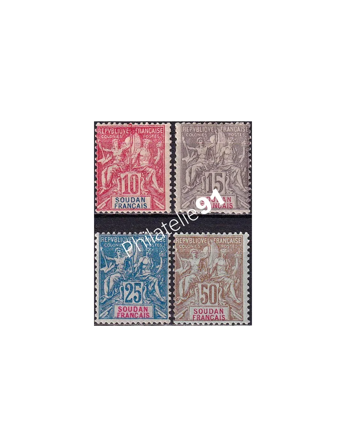 Timbre avec mention "SOUDAN FRANÇAIS" dans le cartouche, en rouge, rose ou bleu.