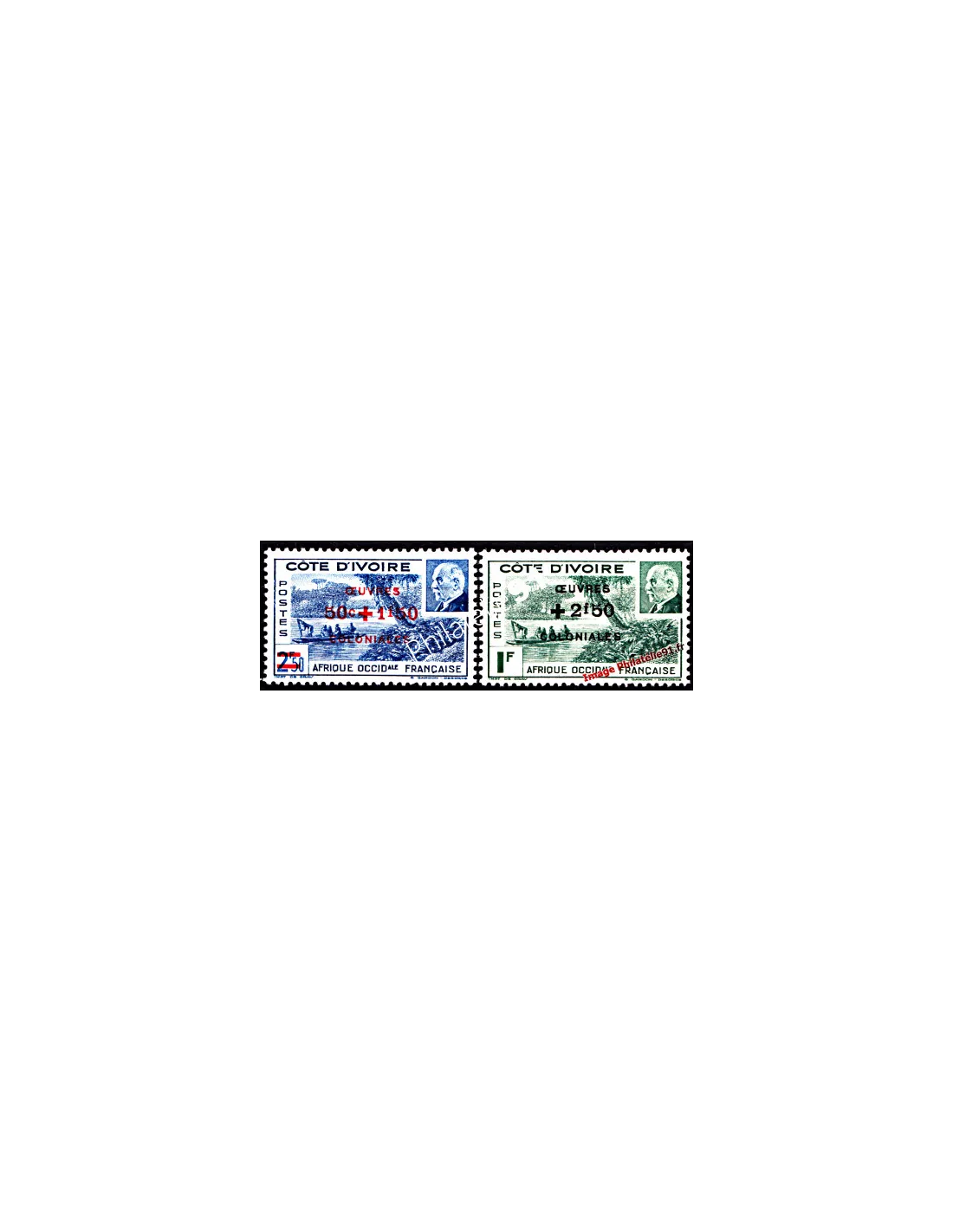 Série complète neuve** - 2 valeurs surchargées "ŒUVRES COLONIALES". Lagune Ebrié et effigie du Maréchal Pétain