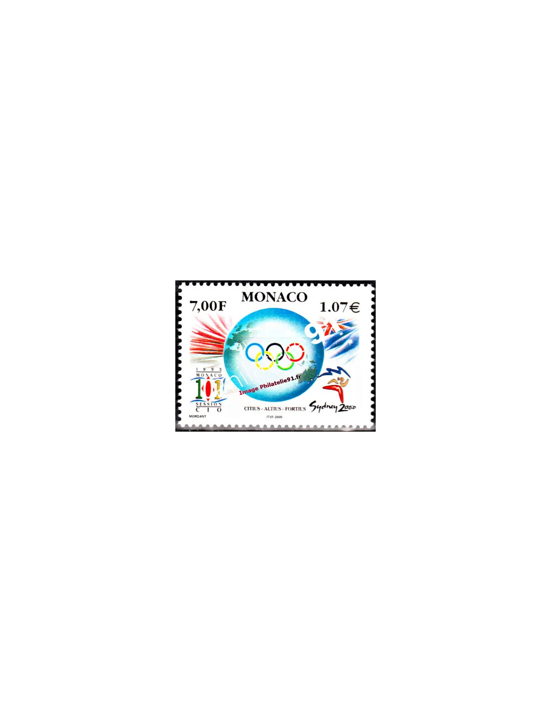 Composition avec logo, anneaux sur globe, logo de la 101ème session du C.I.O. à Monaco en 1993.