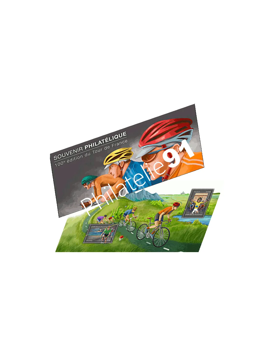 Souvenir Philatélique Tour de France composé d’une carte double illustrée et d’un feuillet gommé reprenant deux timbres du bloc « Centième Tour de France » inséré à l’intérieur de la carte.