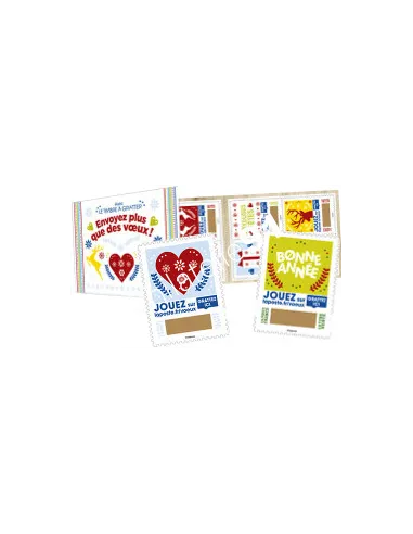 Les timbres du carnet "LE TIMBRE À GRATTER" sont illustrés d’images festives qui invitent à adresser des vœux ou à jouer, ou à inviter le destinataire du courrier à gratter pour remporter un cadeau !