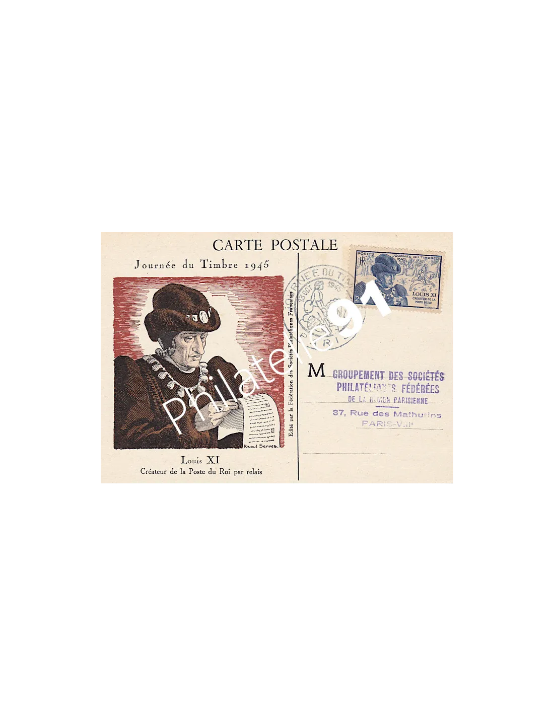 Carte et timbre à l'effigie de Louis XI (1423-1483), créateur de la Poste du Roi.