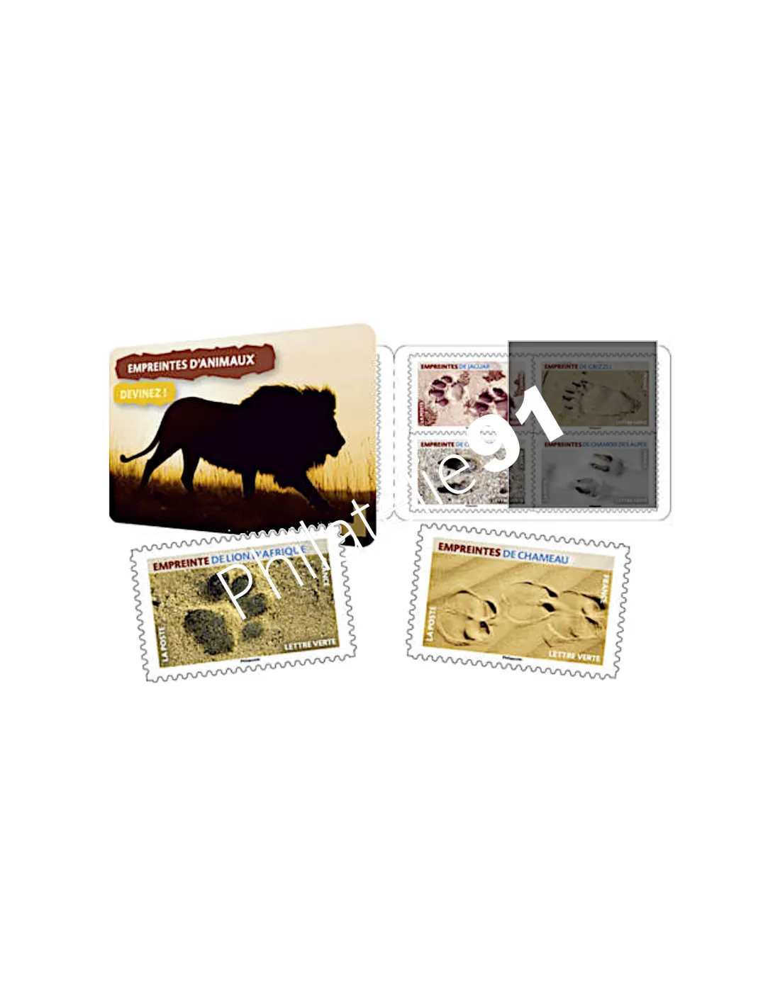Les douze timbres autocollants de ce carnet sont illustrés par des photographies d'empreintes d'animaux.