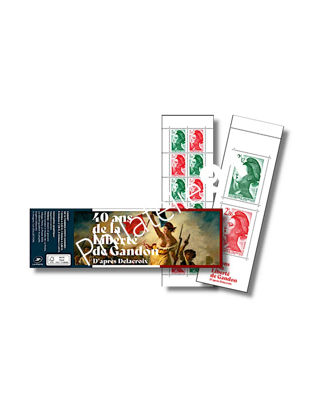 Carnet de 14 timbres "40 ans de la Liberté de Gandon", d’après Delacroix est constitué d'une couverture et de 2 feuillets (1 feuillet de 2 timbres et 1 feuillet de 12 timbres).