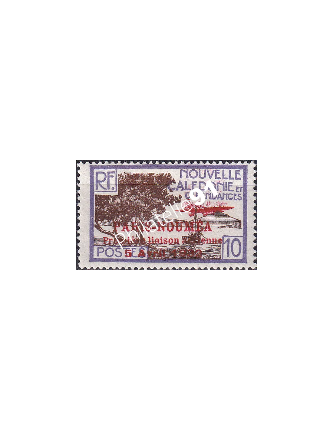 Timbre-poste n° 143 avec surcharge rouge "Paris-Nouméa - Première liaison aérienne - 5 avril 1932".