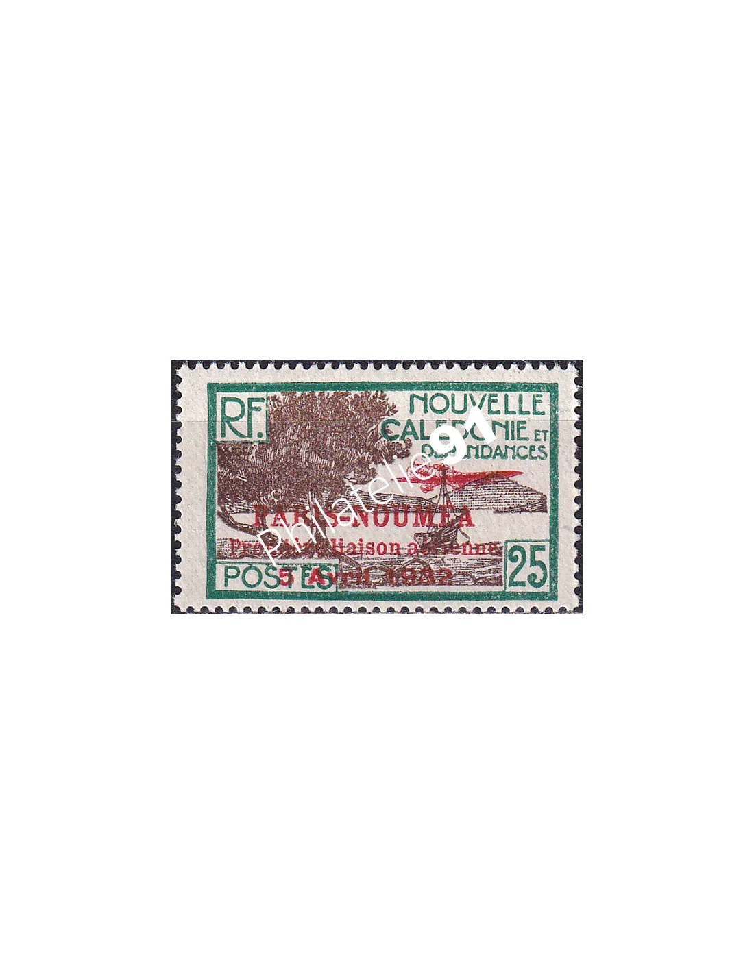 Timbre-poste n° 146 avec surcharge rouge "Paris-Nouméa - Première liaison aérienne - 5 avril 1932".