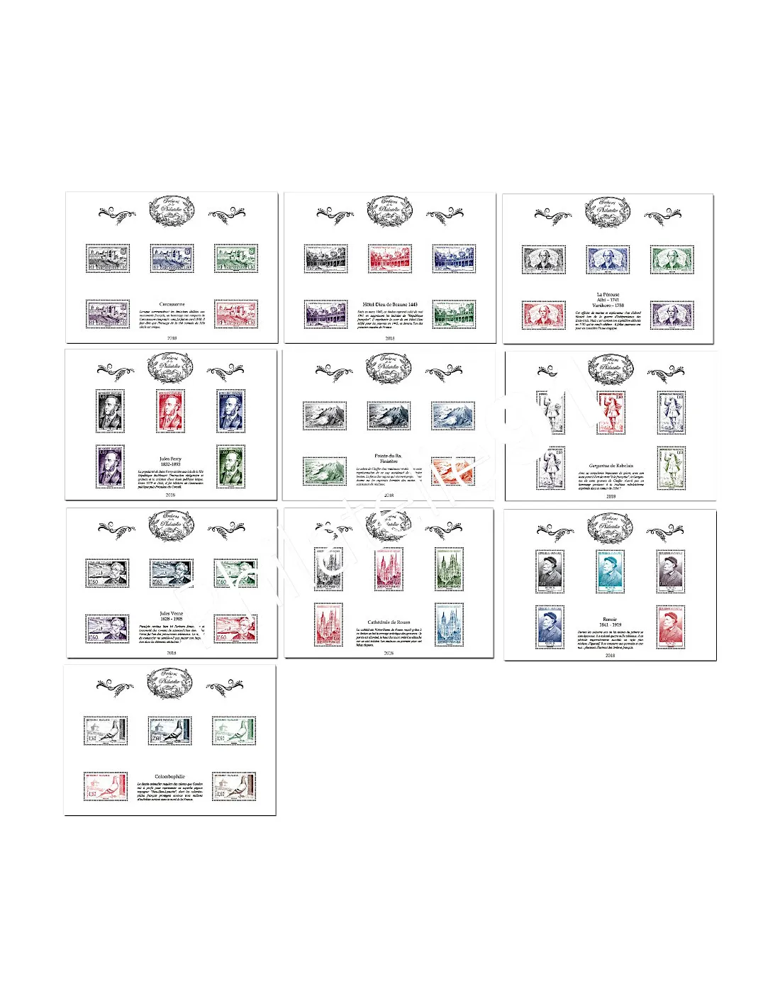 Les trésors de le philatélie ensemble de 10 feuillets de 5 timbres reprenant les plus beaux timbres de France en taille douce.