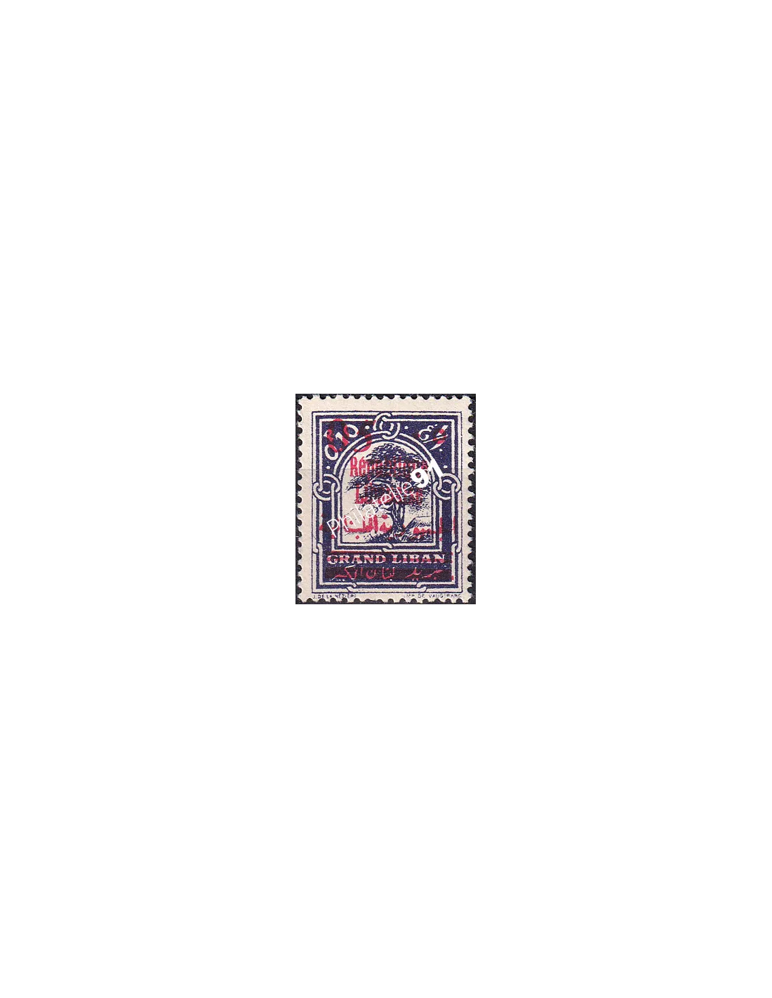 Timbre de 1925 (n° 50) avec surcharge bilingue rouge "République Libanaise", grands traits sur les mentions bilingues "GRAND LIBAN" et nouvelle valeur.