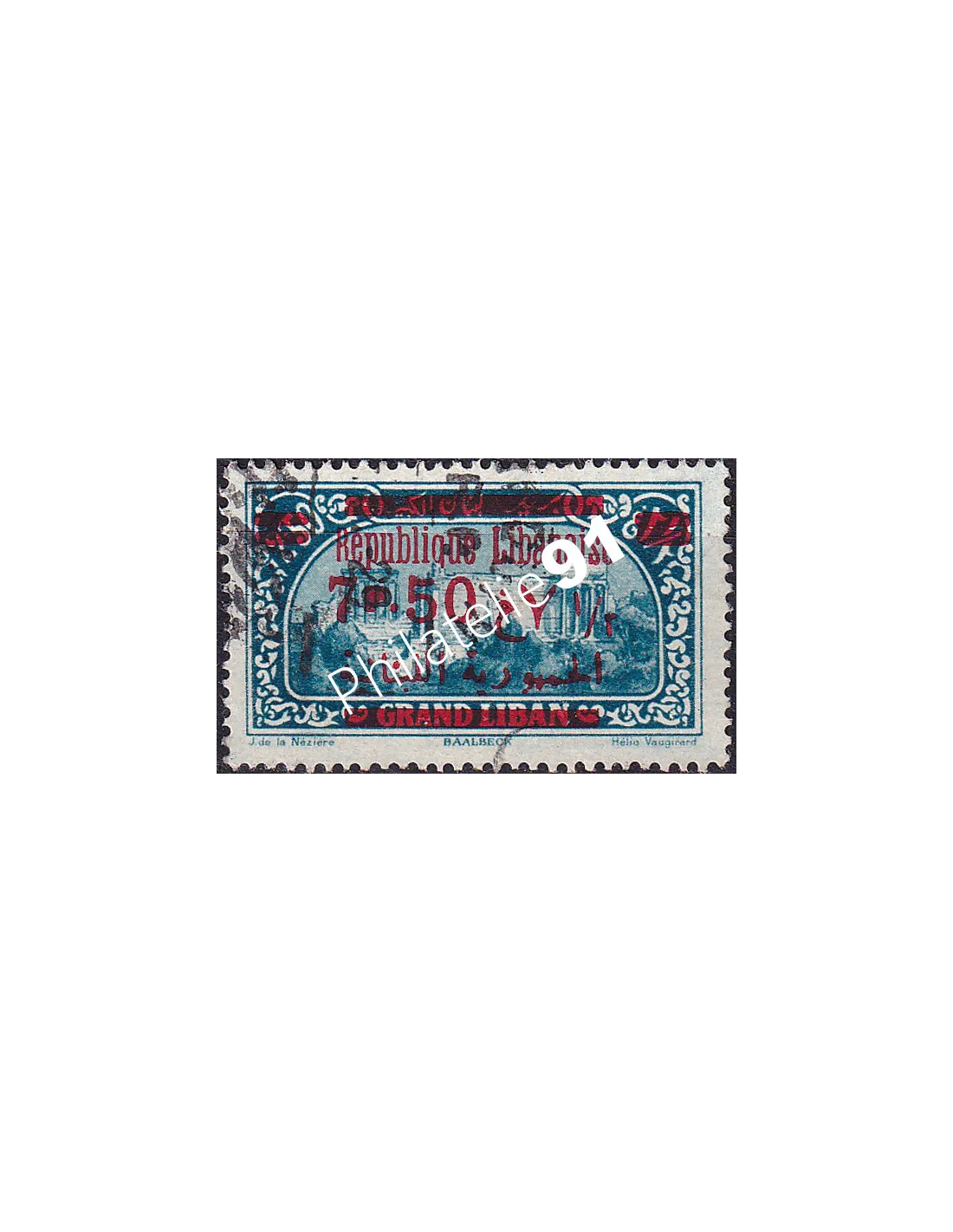 GRAND LIBAN - n° 120 oblitéré - Baalbeck - Timbre avec surcharge bilingue rouge "République Libanaise" + nouvelle valeur