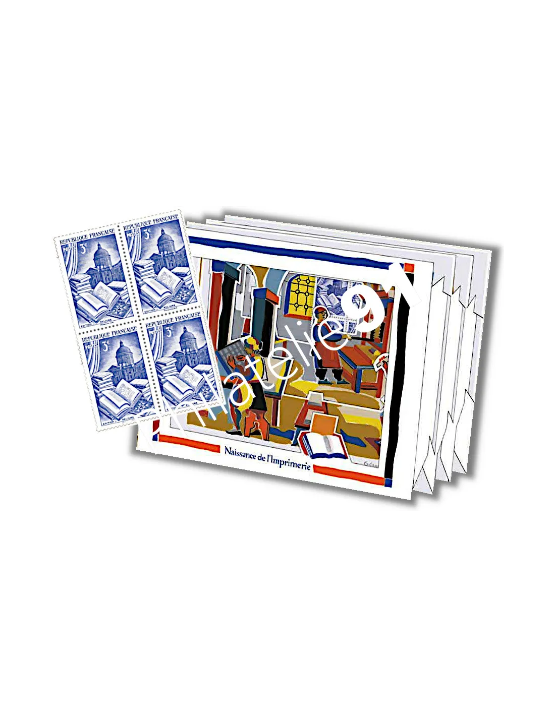 Fabriqué sur papier Rives tradition et sans point de colle, il inclut 4 timbres "ÉDITION et RELIURE" de la série Métiers d’art de 1954, spécialement réimprimés en taille-douce monochrome.