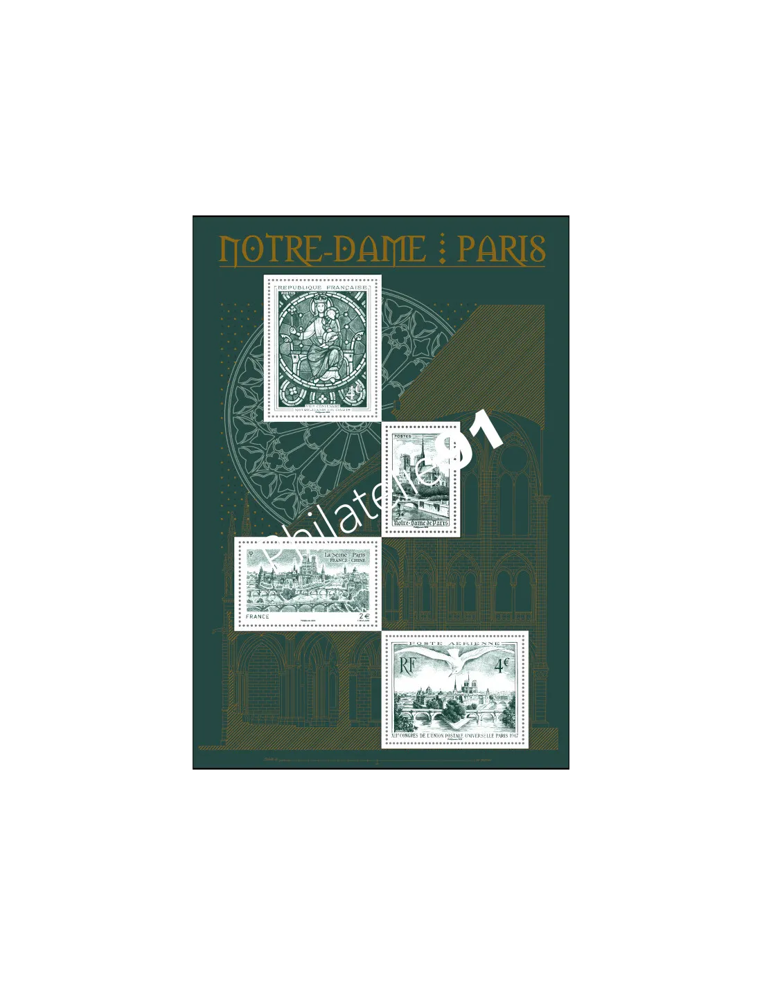 Le bloc doré 2020, de 4 timbres, a pour thème la Cathédrale Notre-Dame de Paris autour de 4 timbres célébrant Notre-Dame au fil des ans.