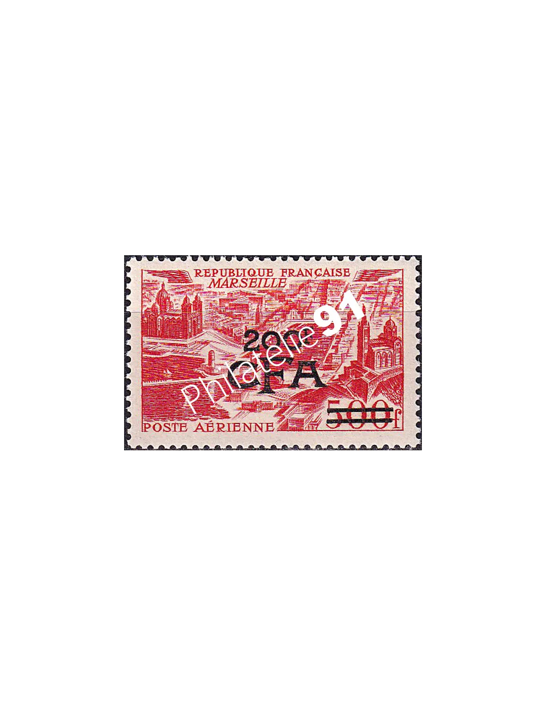 Timbre poste aérienne de France surchargé avec nouvelle valeur en CFA et traits barrant l'ancienne.
