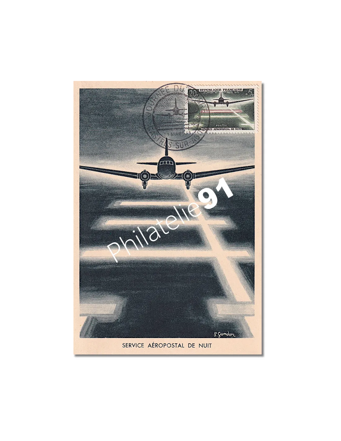 Carte et timbre illustrant le 20ème anniversaire du Service aéropostal de nuit.
