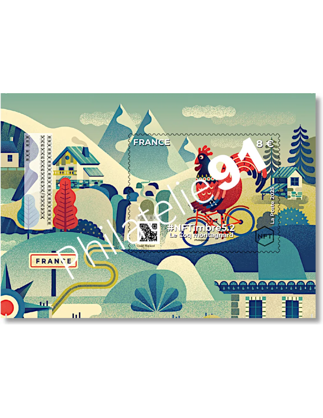 #NFTimbre5.2 - le Coq montagnard, cycliste intrépide, serpente entre les sommets enneigés