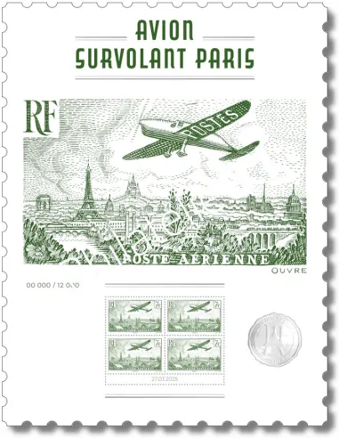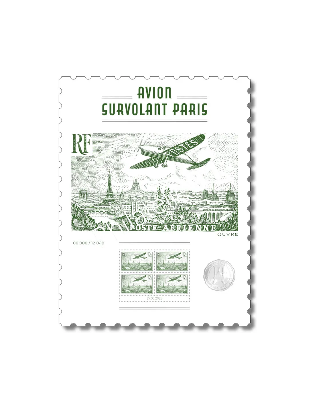 Affiche "Avion survolant Paris" avec bloc daté de 4 timbres.