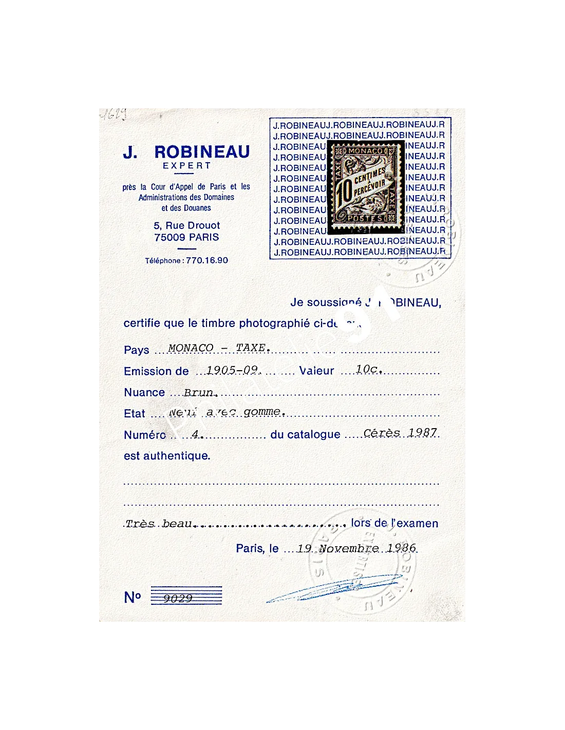 MONACO - Timbres-taxe - n° 4 ** - Type Duval - Livré avec certificat d'expert (OL-251111-9)
