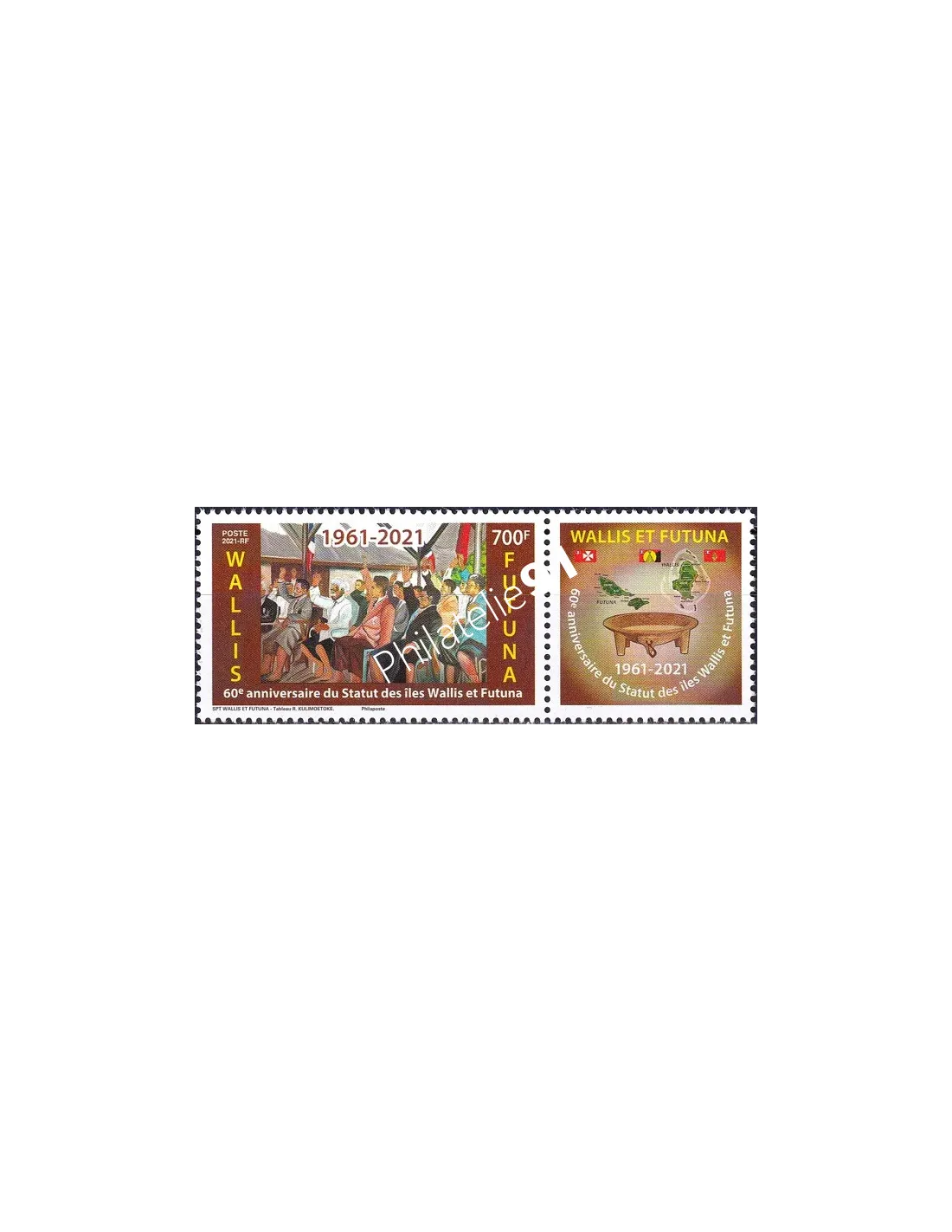 Vignette représentant les îles, les drapeaux de Wallis et Futuna et un tanoa (récipient en bois sur pieds).