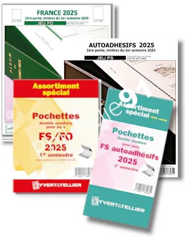 JEU FO (liseré vert) + JEU FS ADHESIFS (liseré noir) FRANCE 1er semestre 2025 + les 2 assortiments de pochettes pour les timbres de l'année 2025.